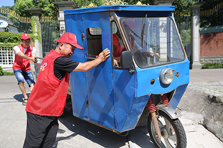 上圖為志愿者服務(wù)隊(duì)合力推離停放不規(guī)范的電瓶車、三輪車