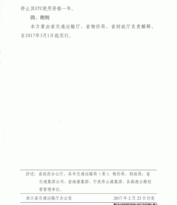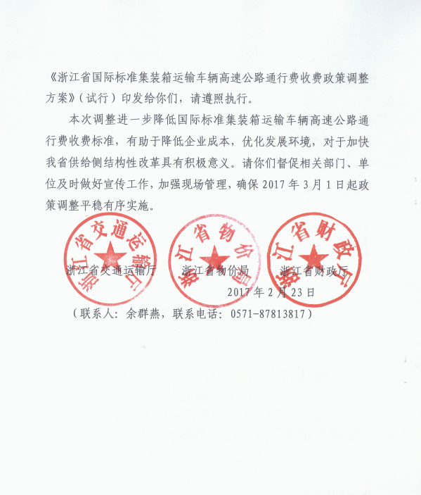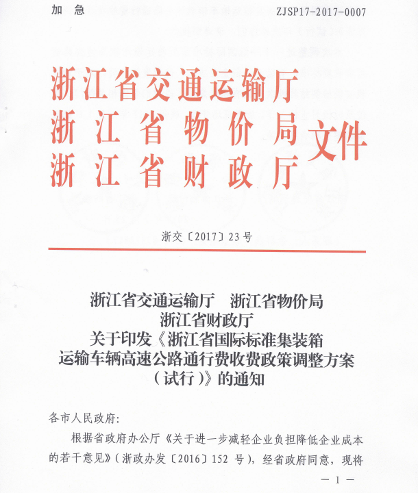 浙江省國際標(biāo)準(zhǔn)集裝箱運輸車輛高速公路通行費收費政策調(diào)整方案(試行) 浙交[2017]23號