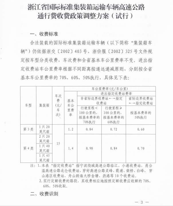 浙江省國際標(biāo)準(zhǔn)集裝箱運輸車輛高速公路通行費收費政策調(diào)整方案(試行)
