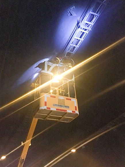 中午11:00,因流量過(guò)大,高速交警要求臨時(shí)開(kāi)放被堵主車(chē)道。趁此空隙機(jī)會(huì),中心隊(duì)伍暫撤到黃土嶺隧道管理所解決午餐,之后又馬不停蹄奔赴并集結(jié)在北洞口緊急停車(chē)帶,待重新封道后繼續(xù)跟進(jìn)作業(yè),力爭(zhēng)在審批時(shí)間內(nèi)做更多的維修??紤]到主車(chē)道燈具損壞不多,抽調(diào)一組登高車(chē)人員負(fù)責(zé)攝像頭檢修工作,而底下人員則負(fù)責(zé)修復(fù)更換消防、緊急電話等標(biāo)志燈,每組人員都在與時(shí)間賽跑,忙的顧不上喝水。