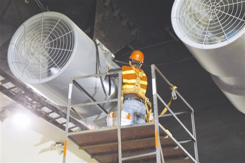 走進(jìn)隧道,一股冷風(fēng)侵襲,洞內(nèi)風(fēng)大又潮。來自湖北的游師傅,負(fù)責(zé)噴隧道墻面乳膠漆。他有著20多年的豐富經(jīng)驗,在施工現(xiàn)場,他頭戴安全帽,身穿反光背心,緊系安全繩,一個人站在高高的架子上,底下4名工人不時緩緩地推動登高架。游師傅全然不顧洞內(nèi)的濕冷,大手一揮,熟練而均勻地噴灑著油漆,沒多久墻面便嶄新一片。