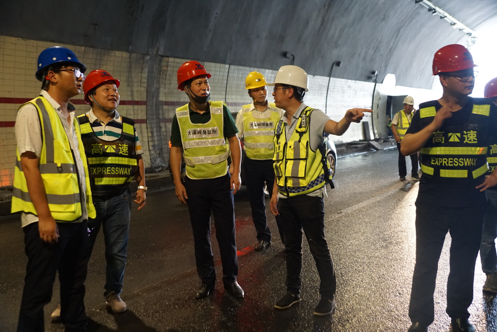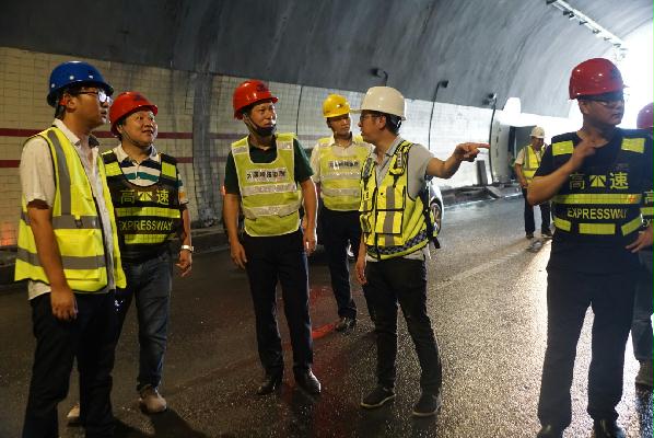 圖為驗(yàn)收小組正在對隧道進(jìn)行初步驗(yàn)收