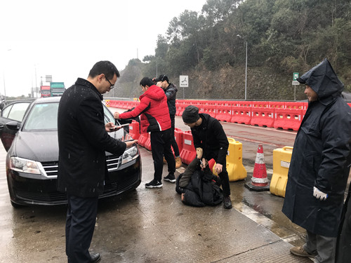31日是春運(yùn)的前一天,下起了今年的第一場(chǎng)大雪。當(dāng)天10:30分左右,三號(hào)車道如往常一樣正常、有序,該車道正在檢查綠農(nóng)車。這時(shí)一輛牌照為浙JVIT6*黑色小轎車緩緩駛?cè)?,突然該車加速調(diào)整方向,想朝二號(hào)車道沖去。與此同時(shí)從它后方快速?zèng)_出一輛轎車檔在了該車前面,接著后方又沖出一輛黑色轎車,攔截在該車后方的去路。兩輛車上跳下幾個(gè)大漢,以迅雷不及掩耳之勢(shì),一擁而上干脆利落的將車內(nèi)三名犯罪嫌疑人控制。 當(dāng)班收費(fèi)員被這一幕驚呆了,不過(guò)迅速反應(yīng)過(guò)來(lái),啟動(dòng)應(yīng)急預(yù)案,呼叫監(jiān)控員,監(jiān)控員在監(jiān)控視頻中發(fā)現(xiàn)這個(gè)情況后,第一時(shí)間通知所長(zhǎng)。所長(zhǎng)孫明偉得知情況后立即趕赴現(xiàn)場(chǎng),確認(rèn)核實(shí)身份,并令當(dāng)班班長(zhǎng)第一時(shí)間聯(lián)系當(dāng)?shù)嘏沙鏊藢?shí)身份。在得到明確的答復(fù)后,工作人員立刻封閉該車道,為民警辦案提供方便,并打開備用車道正常收費(fèi)疏導(dǎo)過(guò)往車輛,組織人員疏散圍觀群眾避免車輛和人員停留過(guò)多影響民警辦案。