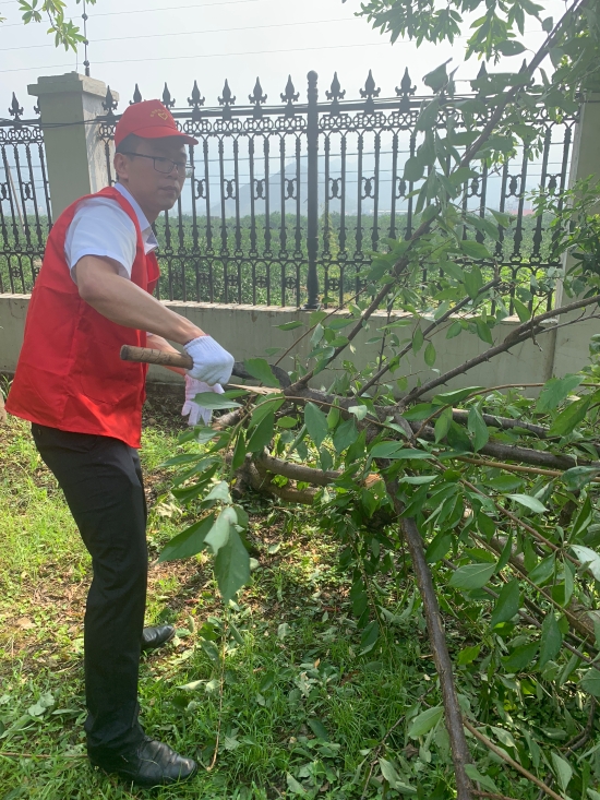 圖為志愿者合影 8月13日上午,該所志愿服務(wù)隊(duì)身穿統(tǒng)一紅色馬甲,積極投身到災(zāi)后恢復(fù)工作中。 “把砍刀給我,我力氣大,讓我來。” 活動(dòng)過程中,孫明偉、杜廣勝、楊堅(jiān)等同志一行先查看了配電房周邊綠化帶,看到有樹木倒伏,壓在防護(hù)網(wǎng)上,存在較大安全隱患,他們二話不說立即手拿砍刀,對(duì)樹木進(jìn)行切割處理,并由李學(xué)平、包德福等人安排拉車將斷木等清理干凈。