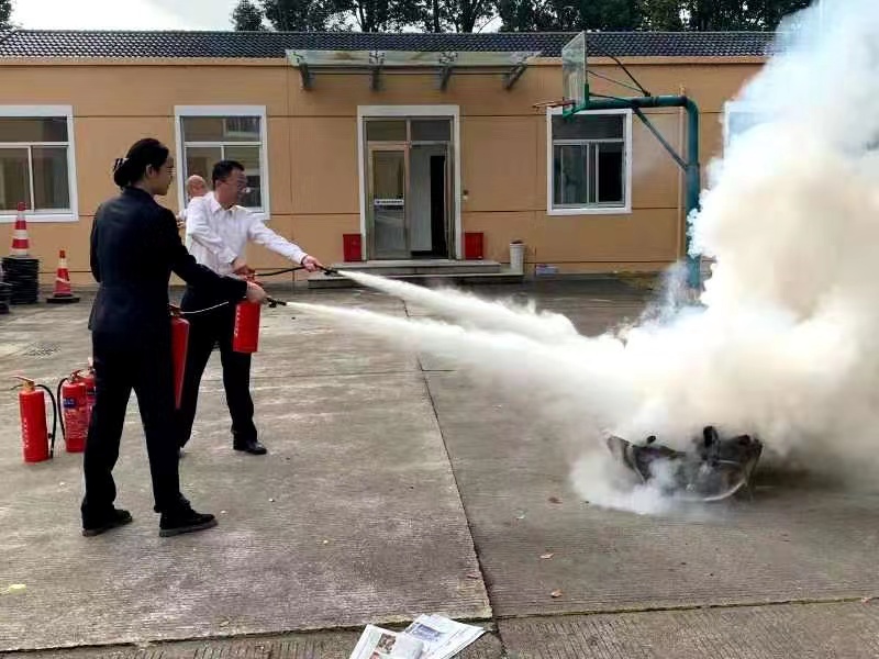 圖為滅火器演練現(xiàn)場 演練現(xiàn)場,老員工們按照“一看二搖三拔四噴”的使用方法,熟練地檢查了滅火器有無過期,隨后搖動瓶身、拔出插銷,對著火源根部噴了下去,熊熊火勢瞬間被熄滅。