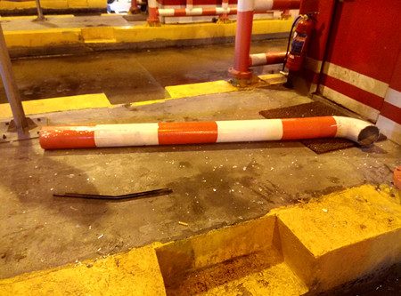 圖為被撞壞的收費崗?fù)?/span> 該車在臺州收費站下高速時,由于車身太長,司機沒察覺到車后半部分所載的傾斜的大米,出收費站時也沒有留意觀看后視鏡,導(dǎo)致傾斜的大米直接把五號收費亭防撞鋼管和收費亭邊窗玻璃撞壞,發(fā)出巨大響聲。收費班長陳幸聞聲后立刻跑到崗?fù)げ炜?/span>,五號車道右前方的防撞欄被撞斷,右側(cè)玻璃破碎,五號崗?fù)?nèi)工作臺上、地面上全是玻璃碎渣,所幸當(dāng)時崗?fù)?nèi)無人在崗,沒有造成人員受傷。 陳幸一邊通知負責(zé)路產(chǎn)勘察賠償?shù)娜藛T到場,一邊協(xié)助司機先將傾斜的幾包貨物卸下,再將車移到外廣場,以免堵住車道,影響四號車道正常通行。最后經(jīng)勘察定損,司機按規(guī)定賠償了500元。 在此,筆者提醒廣大司機朋友,過收費站時一定要慢行,注意四周的收費設(shè)施,并及時檢查所載貨物有無歪斜,既保證自己及他人的安全,也減少不必要的損失。 余娟娟