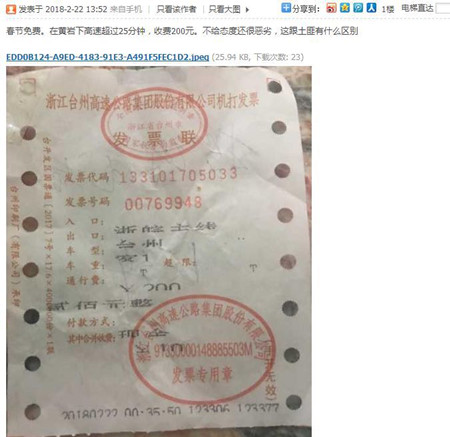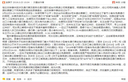 集團(tuán)對(duì)此事件高度重視,當(dāng)即調(diào)取當(dāng)時(shí)多路監(jiān)控錄像,還原了事件真相。2月22日凌晨0:29:50,投訴人駕駛小轎車(chē)進(jìn)入臺(tái)州所6號(hào)車(chē)道,時(shí)間已經(jīng)過(guò)了春節(jié)小客車(chē)免費(fèi)通行的期限,收費(fèi)員黃智超請(qǐng)求出示入口站的通行卡或者紙質(zhì)繳費(fèi)憑證,車(chē)主回答無(wú)卡無(wú)票,聲稱自己是從臨海南上進(jìn)入高速。經(jīng)查證,臨海南并沒(méi)有該車(chē)的入口信息。收費(fèi)班長(zhǎng)再次詢問(wèn)時(shí),車(chē)主說(shuō)“忘記了”,說(shuō)自己“去年過(guò)來(lái)時(shí)只付了20塊錢(qián)”,但是臺(tái)州站出口小客車(chē)最少通行費(fèi)是25元(因?yàn)橛写召M(fèi)10元),收費(fèi)班長(zhǎng)回答不存在有“20元的通行費(fèi)”,司機(jī)忽而改口說(shuō)是天臺(tái)進(jìn)入的,忽而想了一下又說(shuō)是重慶過(guò)來(lái)的,在安徽呆了兩天,當(dāng)天早上從安徽上的高速。班長(zhǎng)再三解釋中途沒(méi)下高速未重新領(lǐng)票或卡,一旦過(guò)了免費(fèi)期限,是哪個(gè)站入口就按哪里收費(fèi)的。“浙皖主線”是安徽進(jìn)入浙江的收費(fèi)站,通行費(fèi)(連代收費(fèi))是小客車(chē)200元。車(chē)主于0:35:46遞給收費(fèi)員200元,收費(fèi)員打印發(fā)票遞回,車(chē)主于0:36:15拿出手機(jī)對(duì)著收費(fèi)員拍照,0:36:30駛離車(chē)道。
