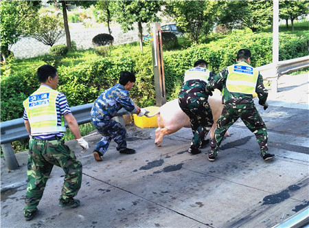 面對突發(fā)的緊急情況,駕駛員一時束手無策,當班副班長立即向值班領導匯報,請求增援。為了防止這頭豬給過往車輛造成安全通行威脅,收費所工作人員及時關閉了7號車道,此時的“二師兄”不讓人靠近,大家只好形成一個包圍圈,不讓它竄到其他車道去。幾分鐘后,增援的高速執(zhí)勤隊員趕到現(xiàn)場,大家七手八腳,終于將這頭豬扛著,送回到了小貨車上。執(zhí)勤隊員說,這輛車上的一頭豬剛剛還在黃土嶺隧道內跳出來一次。