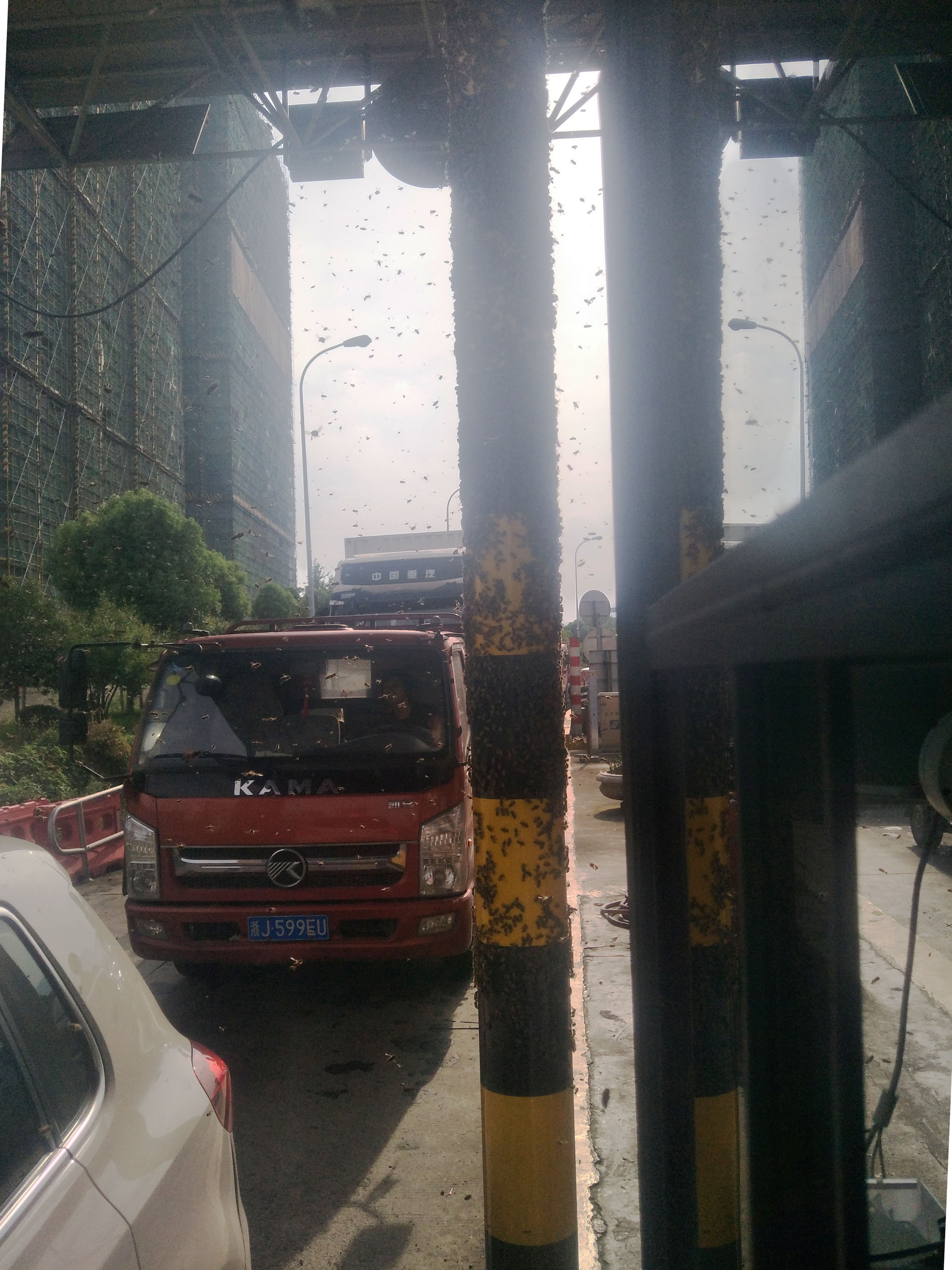 圖為蜜蜂集聚在收費(fèi)站 原來(lái)這輛綠通車運(yùn)輸蜂箱,由于蜂箱沒有關(guān)閉嚴(yán)實(shí),在車通過(guò)車道檢查稍作停留時(shí),大量的蜜蜂乘機(jī)逃出,圍攻收費(fèi)崗?fù)?,天空瞬間一片密密麻麻。它們有的停留在車道的防撞柱上,有的在收費(fèi)窗口附近盤旋,遲遲不肯離開,嚇得過(guò)收費(fèi)站等待繳費(fèi)的司機(jī)不敢開車窗繳費(fèi)。