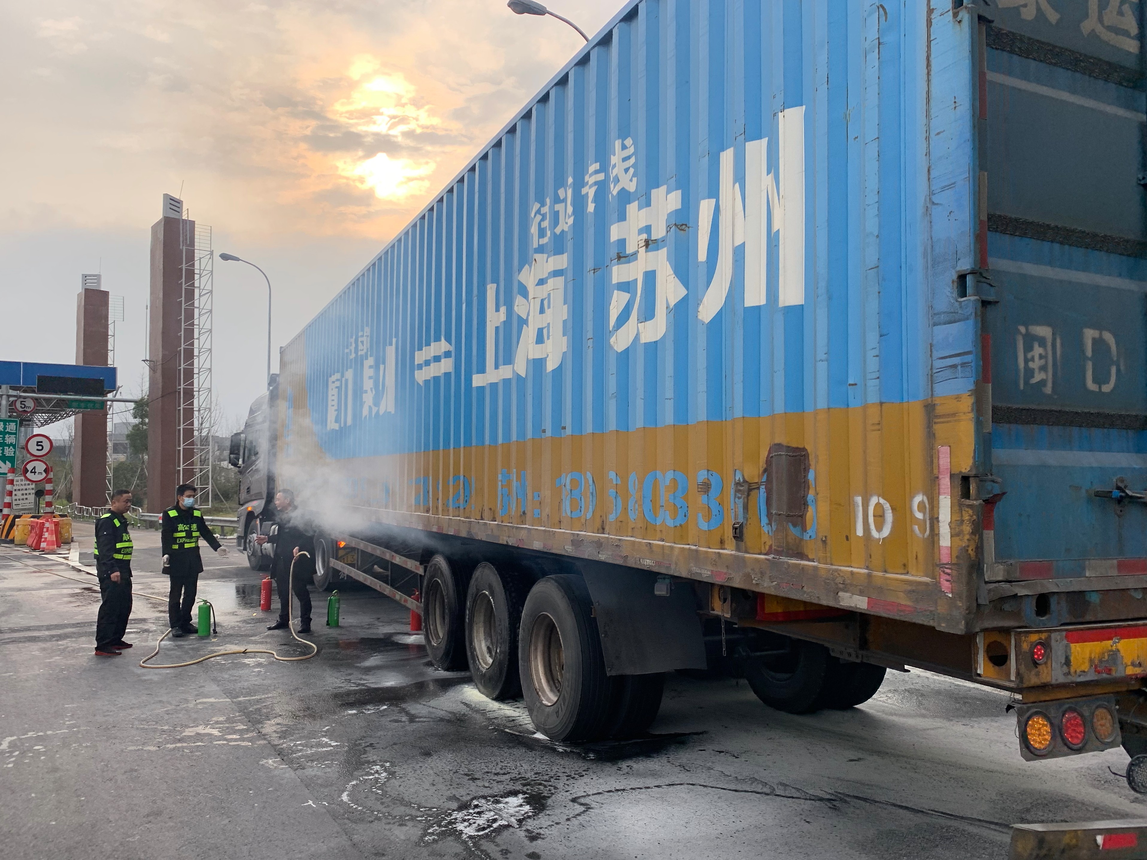 “停車,停車,輪胎起火了?!笔召M員盧靜對著貨車不停搖手,喊話,貨車駕駛員這才發(fā)現(xiàn)情況,在內(nèi)廣場附近停下來。 時間就是生命,時間就是速度,當(dāng)班班長張錚,副班長黃智超和收費員鐘鴻廣第一時間拿起崗?fù)ね獾臏缁鹌鞅枷蚱鸹疖囕v。大家齊心協(xié)力,火苗瞬間被壓了下去。