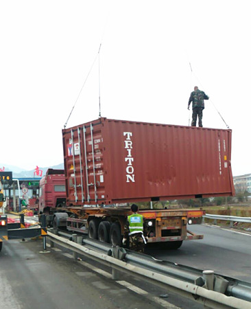 12月15日10:10分左右,一輛車牌為浙B88C06的集裝箱車在臺州南副站選擇出口車道時,因變道和出口運(yùn)載汽車的長掛車發(fā)生碰撞,使得未鎖牢的集裝箱箱體甩落下來,砸到護(hù)欄及進(jìn)口一輛正在通行的貨車車頭,造成護(hù)欄變形、貨車車頭受損嚴(yán)重,所幸無人員受傷。