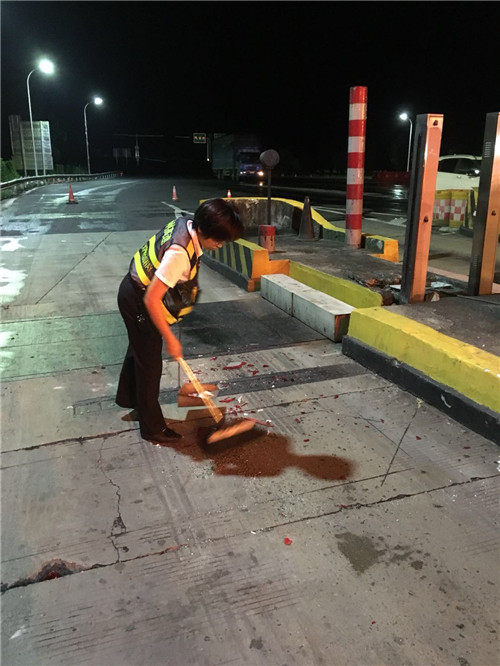 為了保暢通,收費班長讓司機拍照后開到外面等待處理,車輛駛離車道后,發(fā)現(xiàn)稱臺上罩殼跟防護欄被擠彎,地上剩下一堆玻璃碎片殘渣。班長正在處理相關事宜時,發(fā)現(xiàn)收費員張小芬已經(jīng)麻利的在車道上清理殘余碎片,不多久就恢復了超寬車道通行。