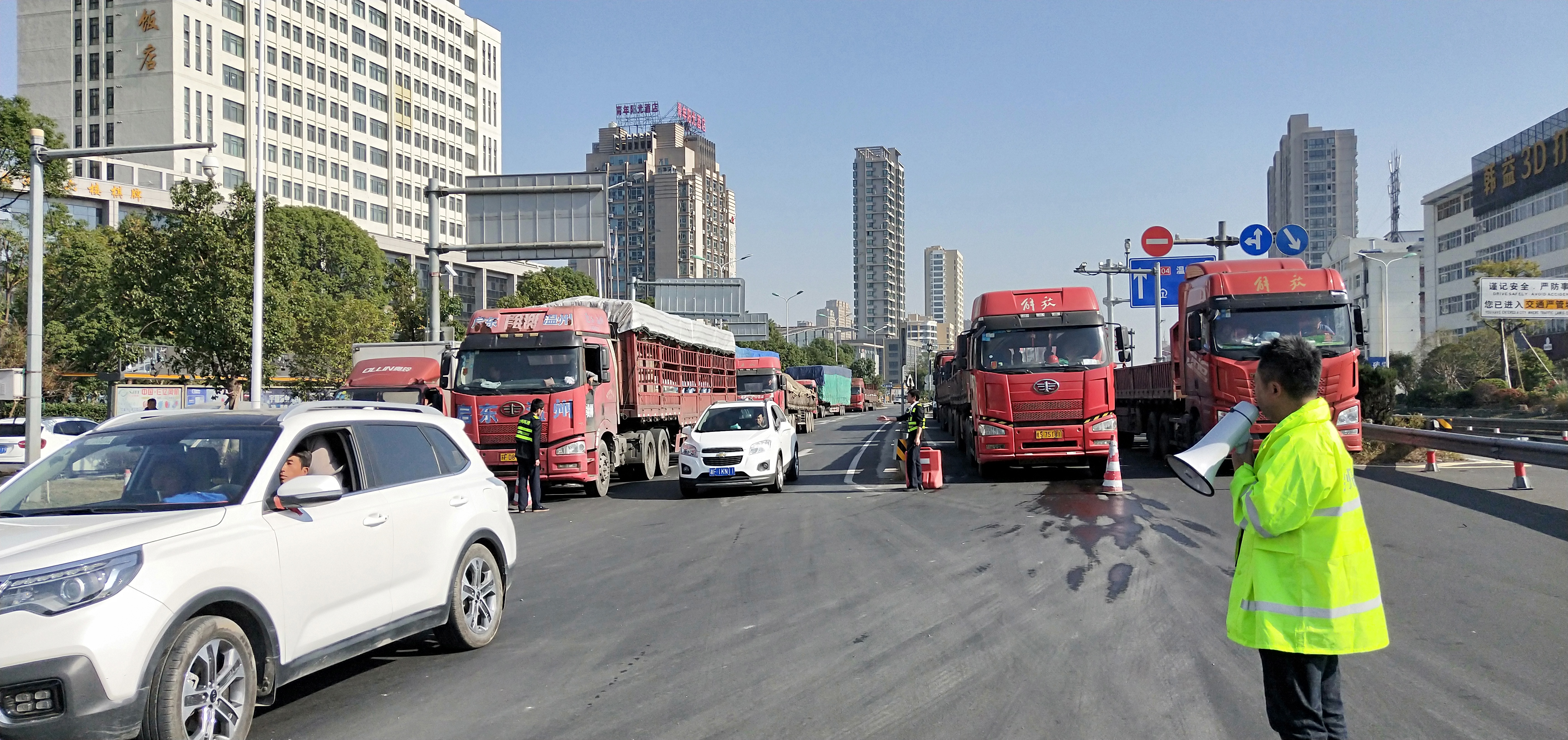 圖為所班子成員帶頭指揮交通 早上8點11分,接到監(jiān)控中心電話:入口開通,開足兩個人工車道。當(dāng)時正值新收費模式開通前對稱重超限車輛勸返工作的開始。經(jīng)過幾個小時封道,此時的入口車流已經(jīng)一望無際,如果碰到超限車輛,勸返更是難上加難。 在困難中想對策,所領(lǐng)導(dǎo)班子成員提出“輪流式放行”:入口的車輛分別是從橋上和橋下過來,分為4個車道,每個車道輪流放行5分鐘,這樣井然有序,不容易造成擁擠和交通事故,并且可以快速放行。每個車道前都擺放了一個小紅帽,專人看守。其他人員分別在入口指揮,藍(lán)牌貨車和未安裝ETC的車輛從大小客車車道通行,大貨車從混合車道通行,裝有ETC的客車和集裝箱走ETC專用通道。大家不斷穿梭在車道、廣場之間,向司機一遍遍耐心解釋,指揮每一輛車順利通行。1名孕婦行動不便,被分在監(jiān)控室接聽電話,查詢?nèi)肟跓o信息的車道。所有人一身汗,忙得顧不上喝一口水,臨近飯點也沒有人主動去吃飯,大家都頂住壓力,從黎明到黃昏一心想著快速準(zhǔn)確高效放行。