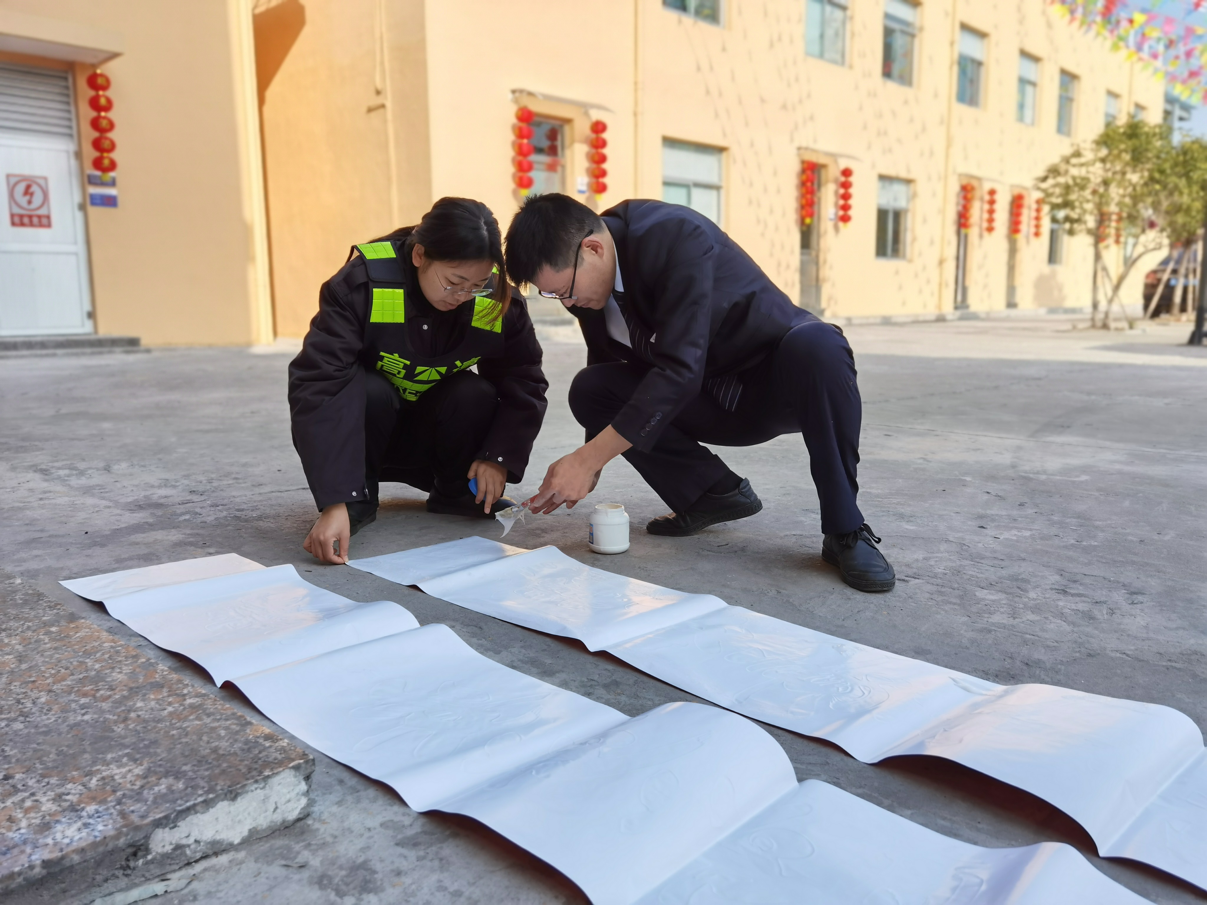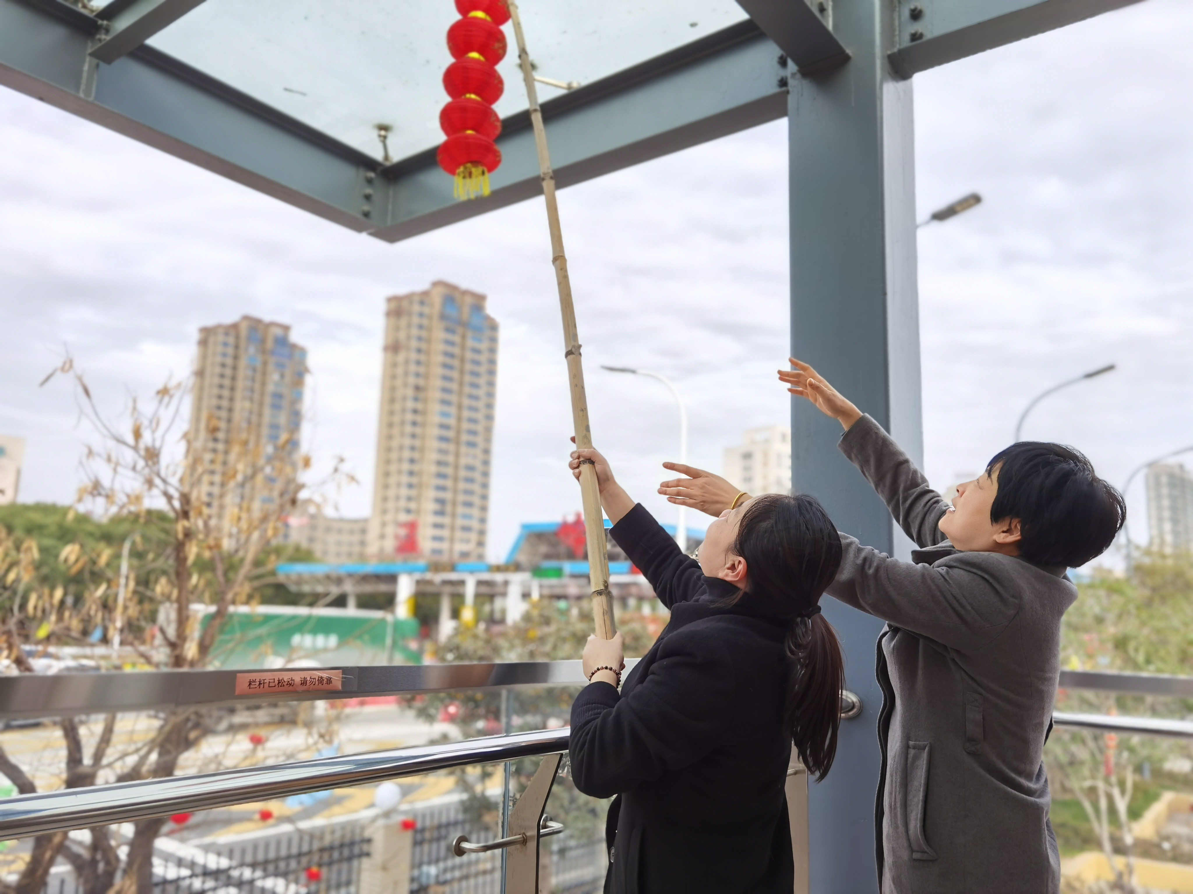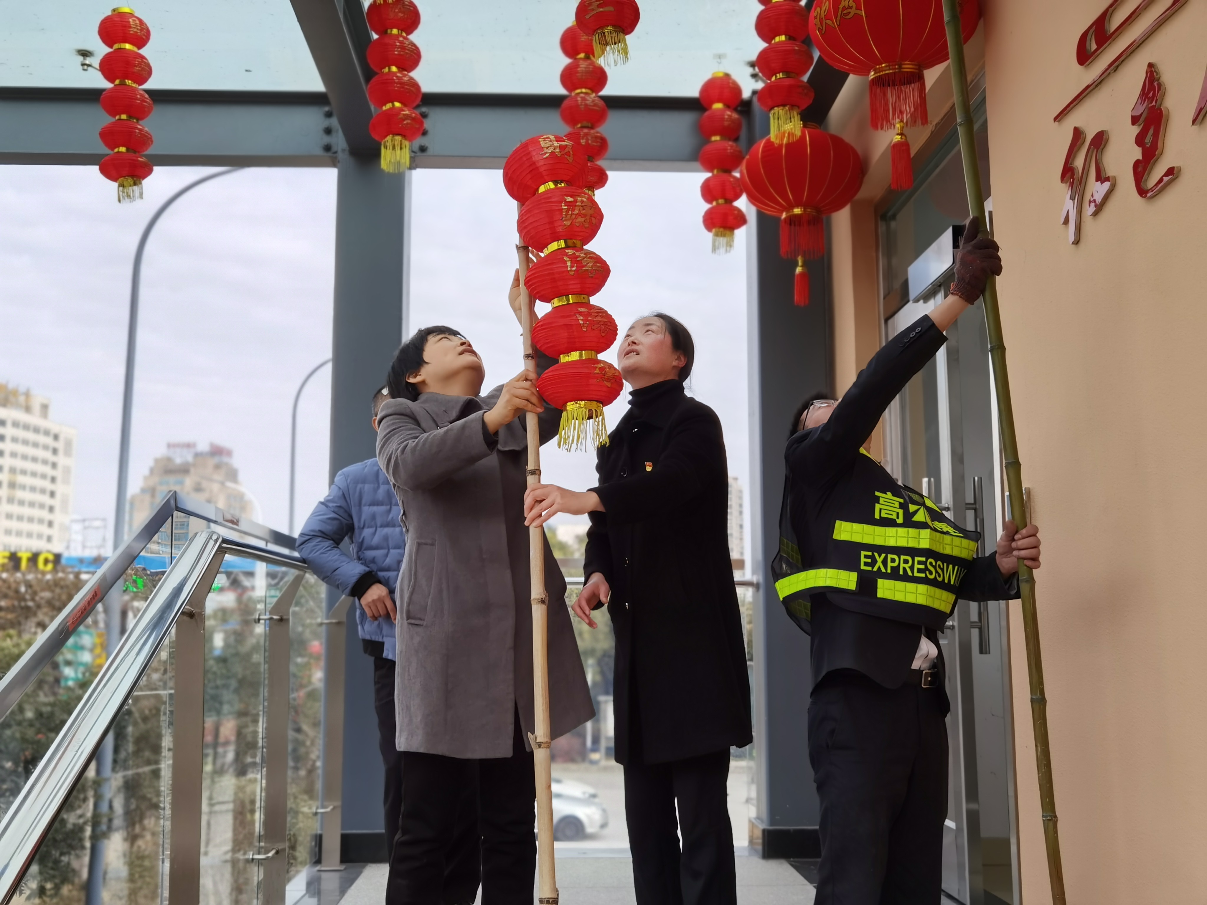 大家分工合作,搬梯子、遞春聯(lián)、貼膠帶、校正高低。在站所內(nèi)每個角落都掛上了紅彤彤的燈籠;收費(fèi)區(qū)域內(nèi)廣場兩邊的欄桿上扎著一面面彩旗。一幅幅精致喜慶的對聯(lián)、“?!弊郑淮遣势?,一個個大紅燈籠把整個收費(fèi)站所點(diǎn)綴得處處洋溢著濃厚的節(jié)日氛圍,“年味”十足,讓在站員工和過往司乘朋友感受到新年的喜慶氛圍和“家”的溫暖。