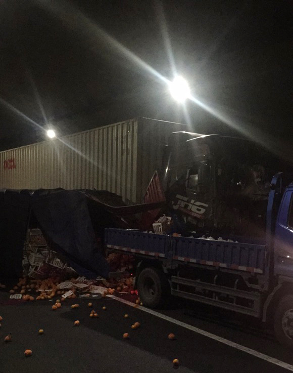 圖為事故現(xiàn)場(chǎng) 得知此情況,所負(fù)責(zé)人第一時(shí)間趕赴事故現(xiàn)場(chǎng)。事故就是命令!救援隊(duì)伍立即兵分三組,一組由駕駛員林通用巡邏車(chē)送傷者至臺(tái)州收費(fèi)所出口,與前來(lái)救援的120救護(hù)車(chē)進(jìn)行對(duì)接,一組由金志輝、宋勤滿(mǎn)在寧向南洞口卡口,一組由李海福所長(zhǎng)、應(yīng)錦清副所長(zhǎng)在現(xiàn)場(chǎng)協(xié)調(diào)指揮,同時(shí)配合交警維護(hù)通行秩序,與交警一起對(duì)事故現(xiàn)場(chǎng)展開(kāi)救援。 經(jīng)了解,由于藍(lán)色貨車(chē)超車(chē)道緩慢行駛,集裝箱與貨車(chē)發(fā)生車(chē)輛剮蹭追尾導(dǎo)致后方送桔貨車(chē)側(cè)翻。貨車(chē)上的桔子多半散落,給清障帶來(lái)一定的難度,管理所負(fù)責(zé)人、高速交警、清障人員、養(yǎng)護(hù)人員共同當(dāng)起了“指揮員”、“搬運(yùn)工”,全力清理事故現(xiàn)場(chǎng)。 16時(shí)36分,由于處理及時(shí),措施得當(dāng),事故未造成大面積擁堵,道路恢復(fù)正常通行。 林玲