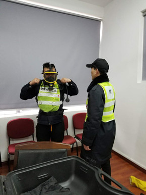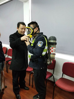 培訓(xùn)中,陶文輝講解了“高速隧道火災(zāi)特點”及呼吸器、防化服的使用方法及相關(guān)要求。話題開啟后,隊員們紛紛參與討論,爭相發(fā)言,講述各自在隧道事故處理中施救和應(yīng)對的經(jīng)歷與心得,交流平日巡查中所需注意的事項,互相提醒工作中的不足,并針對實際問題提出了許多建設(shè)性意見。同時,在主講人的現(xiàn)場演示下,參訓(xùn)人員逐個“以身試法”,進(jìn)一步熟悉和掌握了防毒面罩的穿戴方法。