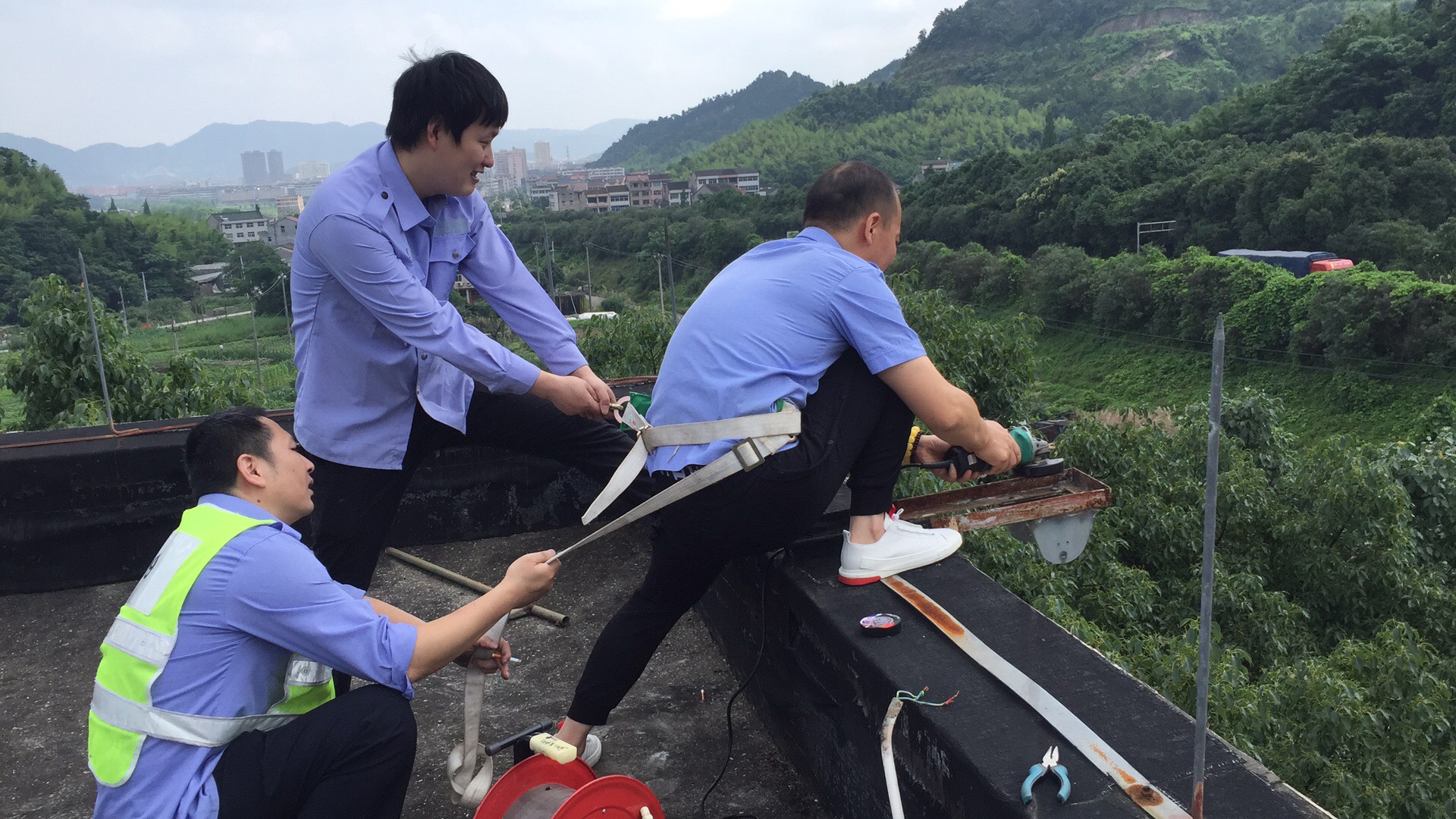 堅持優(yōu)良傳統,執(zhí)勤隊員變廢為寶 6月24日上午,乘著難得的晴天,大溪嶺隧道所執(zhí)勤隊對管理房的標牌射燈進行更換。 由于射燈需設置在屋頂,隊員們需要爬到四樓屋頂。一到房頂,隊員們傻眼了,原來的高壓鈉燈經過風吹日曬地早已銹跡斑駁,燈具無法拆卸。面對困難,黨員干部要沖在前,現在唯一的辦法是用切割機切割,因為高空作業(yè)的危險性,執(zhí)勤隊長站了出來,腰上綁著安全帶,站在屋頂邊緣作業(yè)。拉著安全繩的隊員們都為隊長捏了一把汗,幸好,同事們配合默契,幾個小時后順利完成LED射燈更換工作,新換上的LED節(jié)能燈,不僅使命壽命長,而且又節(jié)能環(huán)保。