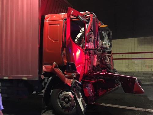 圖為事故車輛 接警后,執(zhí)勤隊(duì)員立即奔赴現(xiàn)場,做好車輛預(yù)警工作?,F(xiàn)場兩輛廂式貨車停在慢車道上,后貨車的副駕駛室被擠壓得嚴(yán)重變形,幸好副駕駛位置無人,否則后果不堪設(shè)想。受傷的司機(jī)坐在電纜溝上,右手臂一直流血,意識清醒。見司機(jī)受傷,隊(duì)長通知中控員撥打救護(hù)車。前車已經(jīng)停在電纜溝上,但是車輛不能移動,隊(duì)員們向司機(jī)詢問之后才了解,前車漏機(jī)油,兩車都需要拖車。隊(duì)員們一邊在隧道內(nèi)疏通交通一邊在等候救護(hù)車和拖車,16:26分,救護(hù)車到達(dá)現(xiàn)場將受傷司機(jī)帶走,17:50分,拖車將兩輛事故貨車拖離,現(xiàn)場恢復(fù)通車。該起事故造成隧道內(nèi)車輛緩行兩個小時,期間封道十多分鐘,事故原因是前車有故障緩慢行駛,因無任何警示標(biāo)志,后車沒有注意而造成追尾。 在此提醒各位司機(jī)朋友,由于隧道內(nèi)外亮度不同,進(jìn)入隧道請?zhí)崆伴_燈減速慢行,在行車過程中要注意前面路況,發(fā)現(xiàn)有問題及時減速慢行,并保持安全車距。如遇突發(fā)狀況,車子無法正常行駛時,為了自已和他人的安全,請及時報警并做好相應(yīng)警示標(biāo)志,防止二次事故的發(fā)生。 陳旦平