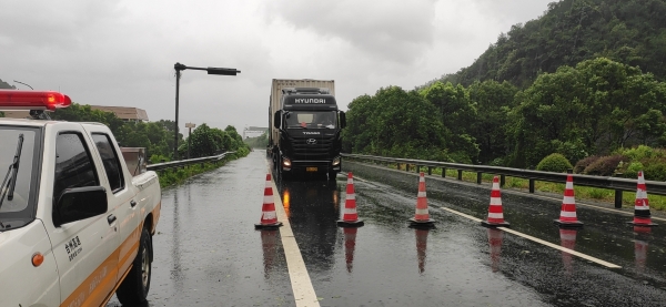 08:12分,接溫州交警通知,受臺風影響,高速上很多車輛發(fā)生側翻事故,要求隊員們在溫向隧道口進行封道,隊員們接警后立即在洞口卡口預警。