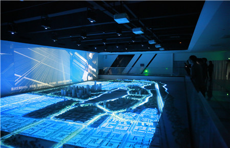 圖為考察團(tuán)觀看東部新區(qū)墻暮宣傳影片