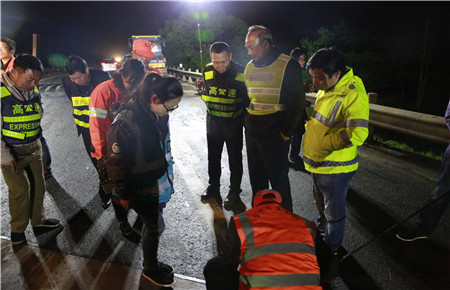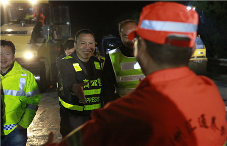 路面養(yǎng)護施工已經第五天,當晚計劃完成K1655+897-K1656+943之間860米的路段罩面,銑刨6個橋頭。工人們每天夜出晝伏,持續(xù)的徹夜工作,違反生理規(guī)律、勞動強度較大,體力精神上都比較辛苦。盡管張建平在此期間一直參加黨校學習,但還是百忙之中特地抽時間到施工現場為工作人員加油打氣。