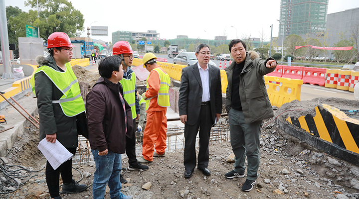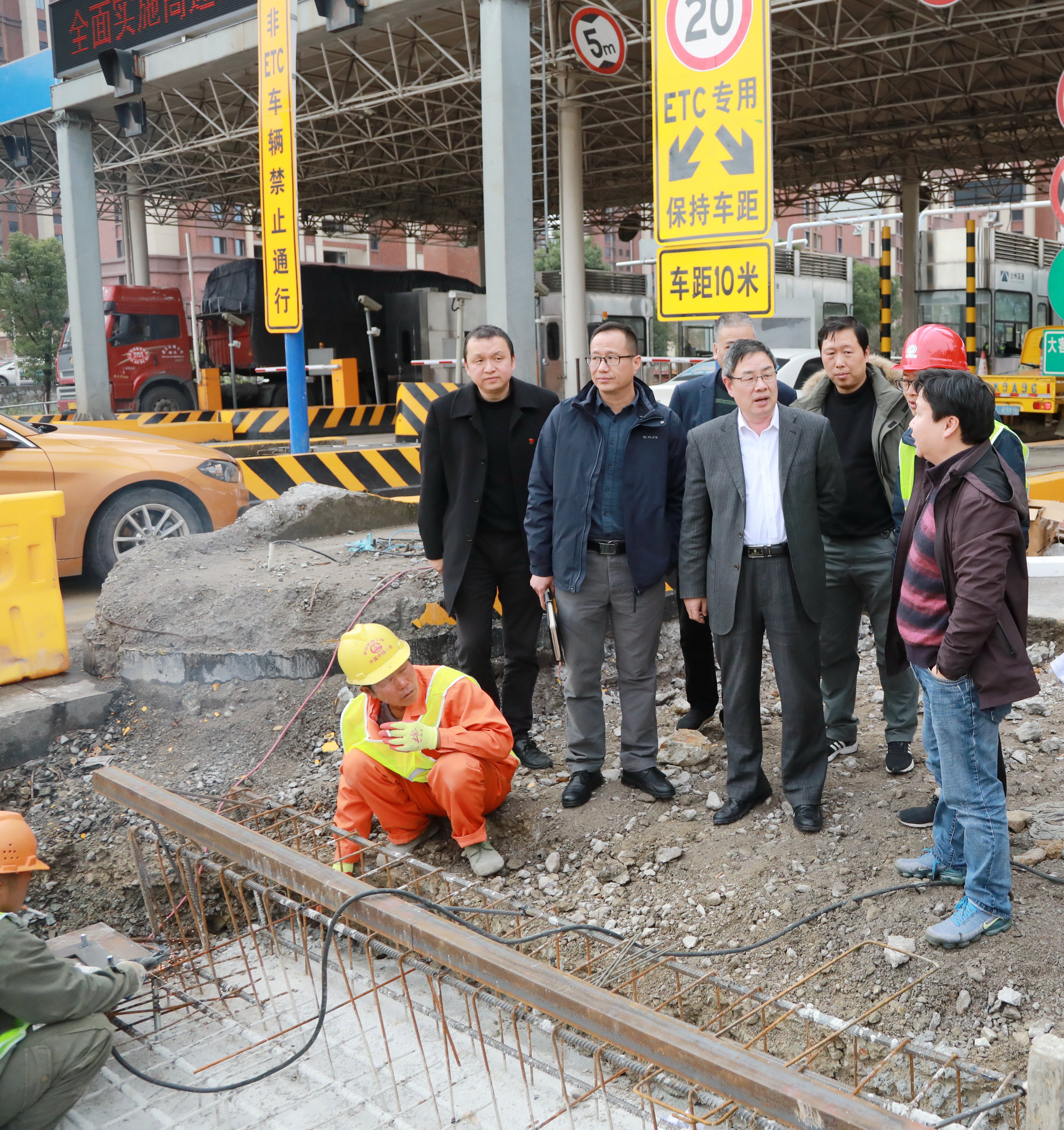 圖為陳文波在收費(fèi)所混合車(chē)道施工現(xiàn)場(chǎng)了解施工進(jìn)展情況