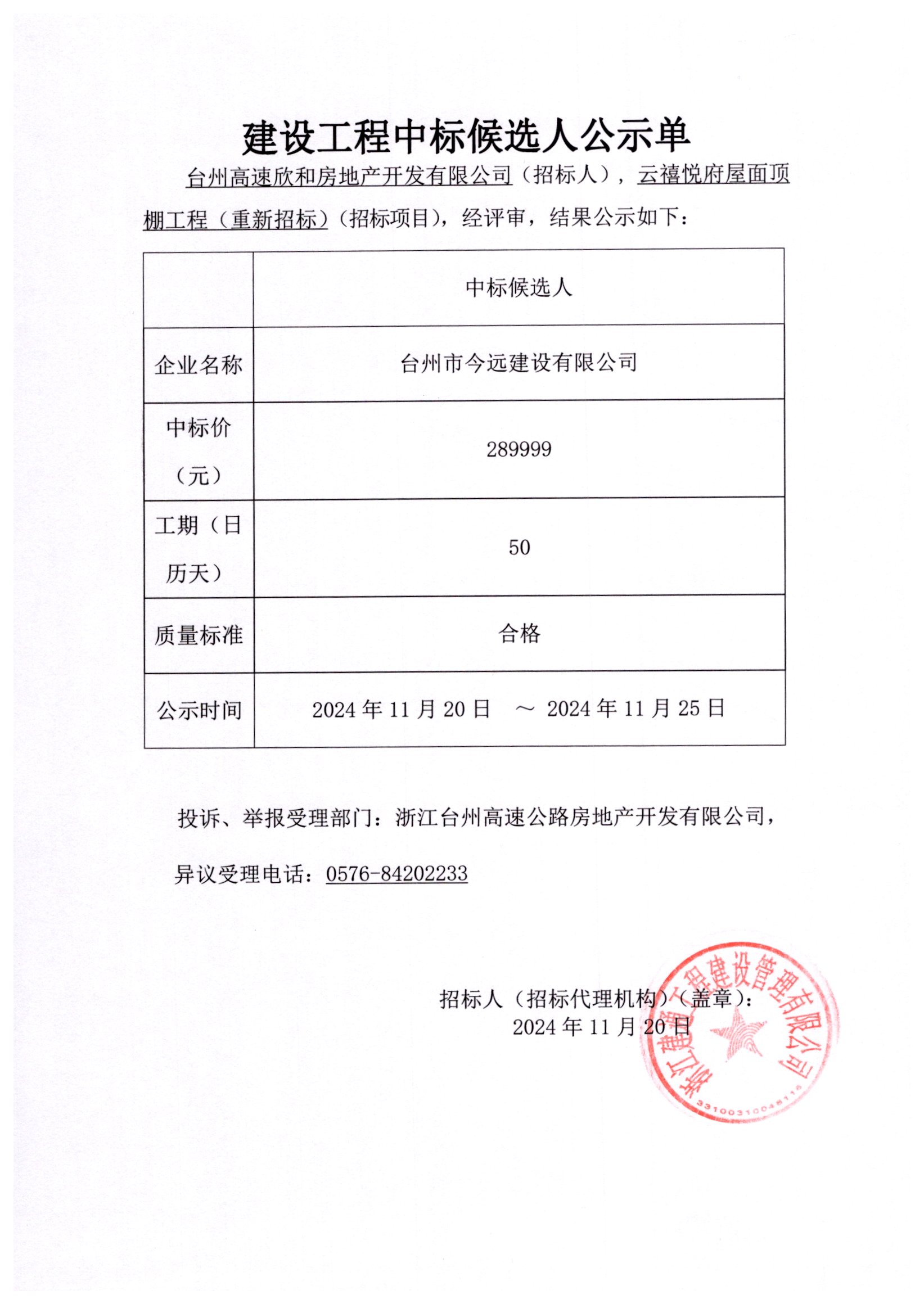 云禧悅府項目屋面頂棚工程重新招標中標候選人公示