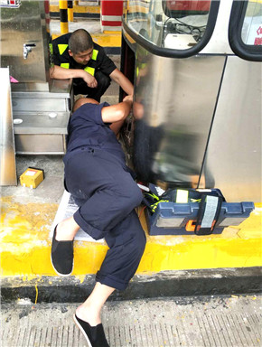 面對(duì)新的挑戰(zhàn),中心隊(duì)員毫不畏懼,憑著嫻熟的技能,做網(wǎng)線、接電源、找插板、聯(lián)系授權(quán)......忙得連喝水時(shí)間都沒(méi)有,他們或彎腰或半蹲,甚至整個(gè)人趴到了地面上就是為了找一根相應(yīng)的數(shù)據(jù)線和配置端口。經(jīng)過(guò)共同努力,新架設(shè)的收費(fèi)電腦一次性通過(guò)了過(guò)車測(cè)試,出口車道瞬間增加一個(gè),三車道成了四車道。