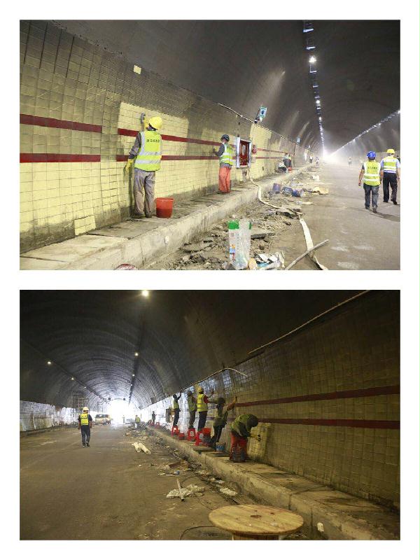 大溪嶺隧道機電整治施工現場,隧道壁正在做墻面處理,隧道內高溫且揚塵惡臭。