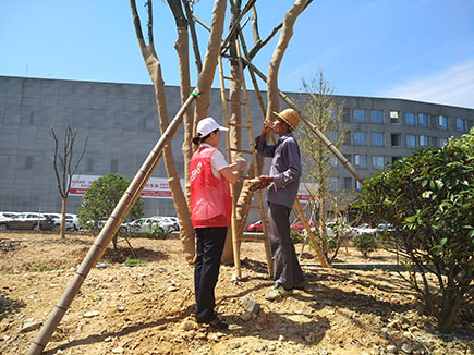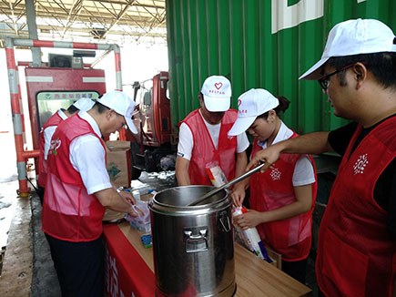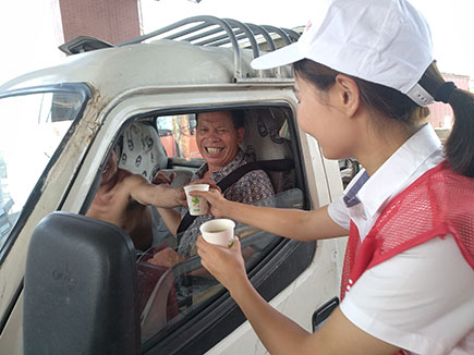 圖為志愿者給養(yǎng)護工人送上綠豆湯