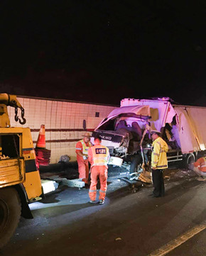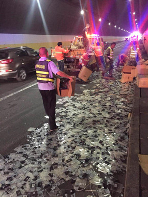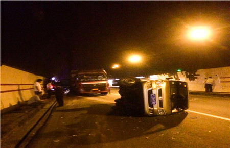 這輛“始作俑者”的車輛由于司機疲勞駕駛,不慎撞擊隧道壁而引發(fā)側(cè)翻,雖然該車內(nèi)無人員受傷,可是跟隨其后的拖掛車就沒那么幸運。拖掛車司機看到前方出狀況,當即采取緊急制動,剎得太急又致使后方小貨車追尾,導致該車車頭嚴重受損,司機的手臂受了傷,運輸?shù)匿X塊也撒了一地。