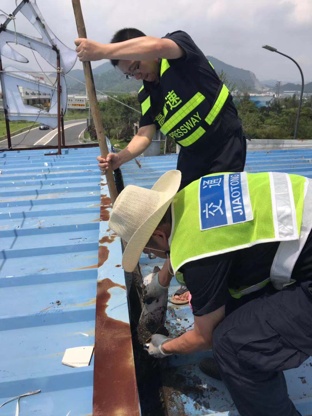 全面清除收費(fèi)頂棚及下水管道垃圾。集團(tuán)沿線收費(fèi)頂棚經(jīng)過幾次的施工裝修,遺留了一些裝飾垃圾,如不及時(shí)清理一旦掉入排水溝或下水管道,勢(shì)必會(huì)造成頂棚漏水,影響下面人員及設(shè)備安全。8月7日,維養(yǎng)中心組織班員在登高車協(xié)助下,頂著炎炎烈日,利用垃圾夾、鐵鍬等工具對(duì)沿線收費(fèi)站收費(fèi)頂棚上方垃圾、排水溝中的淤泥進(jìn)行了逐一清理,并重新鋪設(shè)排水溝上面的防護(hù)網(wǎng),防止臺(tái)風(fēng)期間吹來的一些塑料紙袋等輕型垃圾再次堵塞下水道。