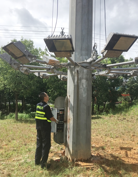 及時(shí)下降各收費(fèi)所互通區(qū)高桿燈。為提升互通區(qū)照明亮度,減少因選錯(cuò)路口而帶來的不必要的麻煩,集團(tuán)在各收費(fèi)站出入口互通區(qū)共安裝了11盞40米高度高桿燈,每盞高桿燈上方有12盞鈉燈。倘若這些高桿燈上鈉燈在臺(tái)風(fēng)襲擊下一旦掉落后果將不勘設(shè)想。8月8日,中心再次召集各班人員對(duì)收費(fèi)沿線高桿燈進(jìn)行了下降處理。因高桿燈四周雜草叢生,在下降時(shí)維修隊(duì)員不僅要忍受底下蚊蟲肆意叮咬,還要克服時(shí)而烈日時(shí)而大雨的怪異天氣,沒放幾盞隊(duì)員便濕透了全身,衣服是濕了又干,干了再濕。