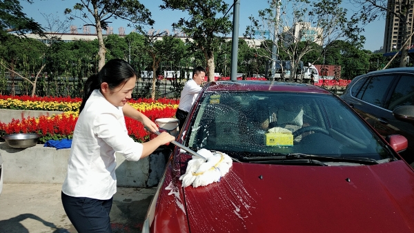 溫嶺西支部書記周超帶領黨員服務群眾 當天上午,活動一開始,前來洗車的車輛絡繹不絕。在支部書記周超的帶領下,五名黨員便開始分工合作。兩名男同志負責沖水、上泡沫、擦洗、再沖水,兩名女同志負責擦干和吸塵器清掃內(nèi)室,還有一名男同志負責開車挪車,需要清洗的車輛一輛接著一輛,黨員同志們顧不得擦干身上的被水濺濕了的衣服,忙得不亦樂乎。看著被洗得一塵不染的車,大家都不約而同地會心一笑。