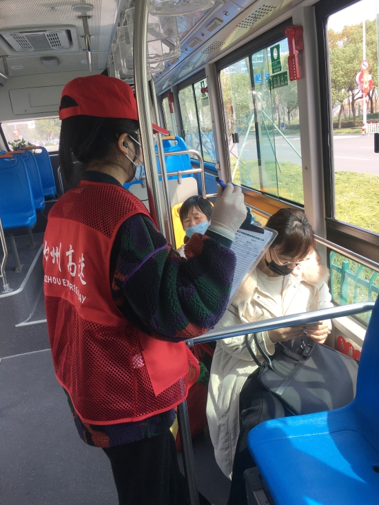 圖為志愿者跟車防疫服務(wù) “我所在的一班車來回一趟是1個(gè)多小時(shí),疫情期出行人員不多,大家上車前都會(huì)認(rèn)真配合檢查?!泵g聆說道,她一次連續(xù)跟車要3個(gè)多小時(shí)。 疫情在前,國企擔(dān)當(dāng),臺(tái)州高速人會(huì)持續(xù)共戰(zhàn)疫情,哪里有需要,挺身在哪里,以行動(dòng)詮釋高速責(zé)任,展現(xiàn)高速風(fēng)采。