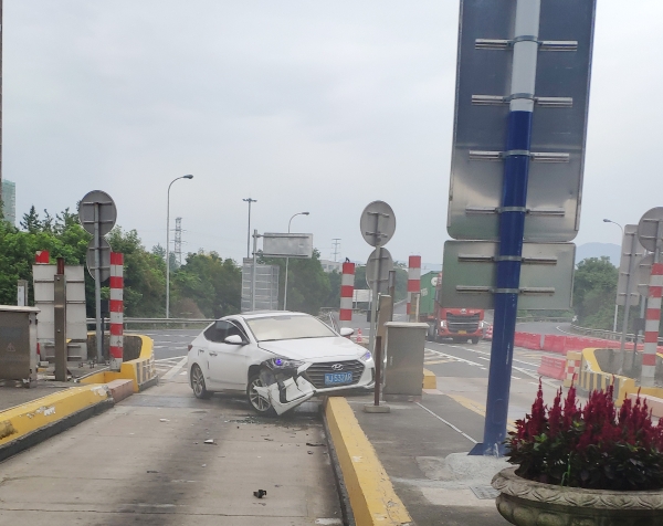 9月8日上午7點(diǎn)30分,一輛白色現(xiàn)代轎車(chē)在臺(tái)州收費(fèi)所出口準(zhǔn)備進(jìn)入ETC車(chē)道時(shí),突然撞向車(chē)道右側(cè)的全安島,在與安全島發(fā)生碰撞后,又一頭撞向了左側(cè)的安全島。 碰撞后的轎車(chē)半邊車(chē)身掛在了安全島上,車(chē)道上的光幕也因撞擊受損。收費(fèi)班長(zhǎng)在聽(tīng)到一聲巨響后,第一時(shí)間跑上前去查看情況。因?yàn)閯×业淖矒?/span>,轎車(chē)的右側(cè)已經(jīng)在地上灑落一堆碎片。坐在副駕駛的女士從車(chē)上下來(lái)查看車(chē)況,隨后男司機(jī)也從另一邊打開(kāi)車(chē)門(mén)下來(lái)。所幸撞擊并未造成人員受傷。班長(zhǎng)在確認(rèn)司機(jī)及乘客均無(wú)受傷后,一邊將事故報(bào)告監(jiān)控中心讓施救車(chē)輛前來(lái)救援,一邊提醒司機(jī)報(bào)警,人員站到安全島上方,不要隨意在車(chē)道上走動(dòng)。然后迅速跑到車(chē)道入口將水碼擋在車(chē)道口以防止有其他車(chē)輛誤入發(fā)生二次事故。