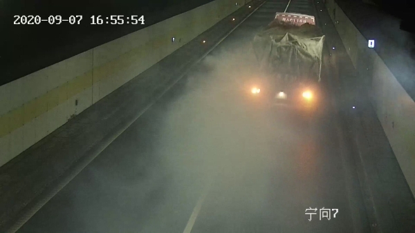 9月7日下午16點(diǎn)53分,一輛大貨車駛?cè)雽幭螯S土嶺隧道,打著雙閃燈,整車發(fā)散出濃濃的煙霧,造成隧道內(nèi)能見度極低。