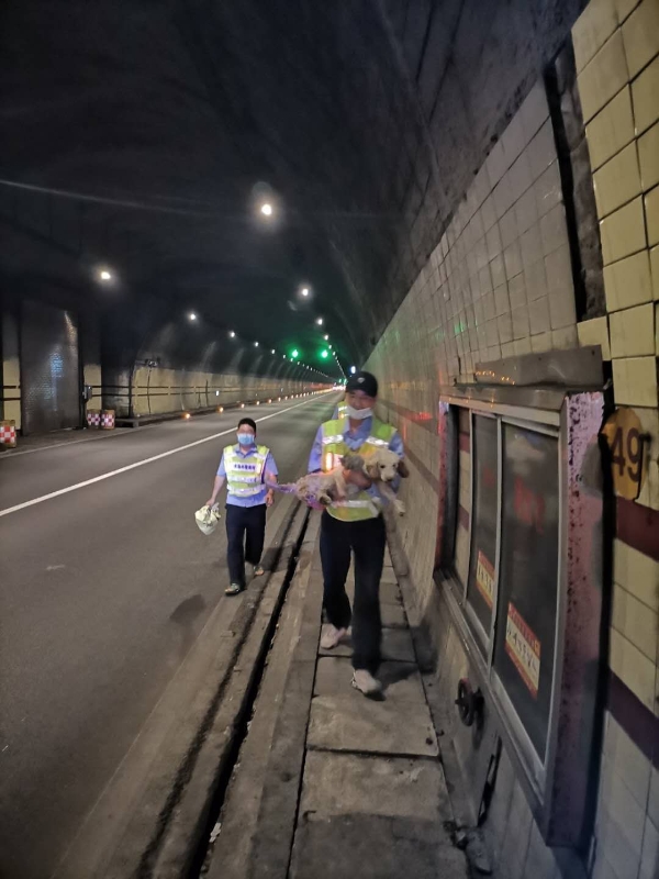 為確保安全,執(zhí)勤隊(duì)員們帶上手套,拿著掃把和麻袋,到達(dá)現(xiàn)場(chǎng)后發(fā)現(xiàn)是一只白色的拉布拉多犬,它一動(dòng)不動(dòng)地趴著,可憐巴巴地看著隧道里的車(chē)子極速而過(guò),很顯然小狗感覺(jué)到害怕,知道趴在這里才是最安全的。隧道所安保人員陶文輝再三確認(rèn)小狗沒(méi)有攻擊意圖后,試著慢慢靠近它,給它喂食香腸,并耐心安撫,直至順利地將其抱起,帶上了巡邏車(chē)。狗是靈性的動(dòng)物,認(rèn)準(zhǔn)了第一個(gè)抱起它的陶文輝,乖乖地依偎在他的懷里。 此前,隧道里從未出現(xiàn)寵物狗被遺忘的事,執(zhí)勤隊(duì)長(zhǎng)忙回到監(jiān)控室查看錄像,準(zhǔn)備幫它尋找主人,經(jīng)過(guò)仔細(xì)查找終于發(fā)現(xiàn)隧道里有過(guò)一次大堵車(chē),小狗就是那個(gè)時(shí)候被主人遺忘的。按照時(shí)間推算,這條小狗已經(jīng)在隧道里呆了近14個(gè)小時(shí),還好它聰明,趴在那兒一動(dòng)不動(dòng)沒(méi)有到處亂跑。最后經(jīng)過(guò)半個(gè)多小時(shí)的查找,隊(duì)長(zhǎng)終于與車(chē)主取得聯(lián)系,晚上22點(diǎn)左右,車(chē)主來(lái)到大溪嶺隧道所認(rèn)領(lǐng),多次感謝我們對(duì)小狗的救援和照顧。 孫鵬