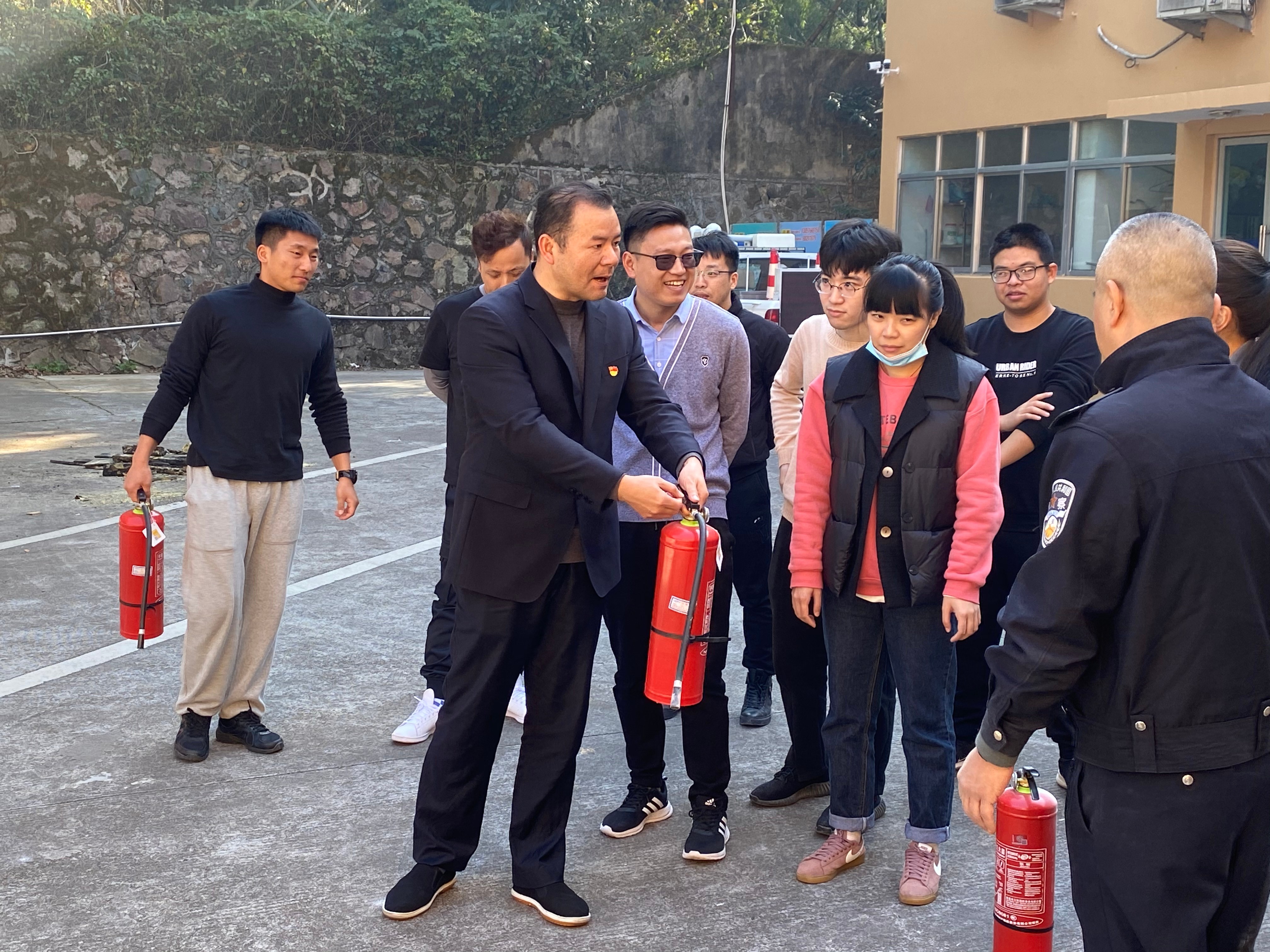 “左手提滅火器,右手拔插銷,要對準火焰根部進行噴射,人一定要站在上風口,手千萬不要擋在噴頭前……”