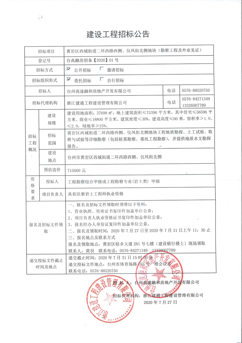 黃巖區(qū)西城街道二環(huán)西路西側(cè)、儀鳳街北側(cè)地塊(勘察工程及外業(yè)見證)建設(shè)工程招標(biāo)公告