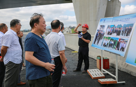 圖為在6#立交上了解工程建設(shè)情況 老干部一行實(shí)地踏勘了內(nèi)環(huán)路(黃巖段)各施工現(xiàn)場(chǎng),全面了解了四個(gè)標(biāo)段工程當(dāng)前建設(shè)情況。一路上,老干部們一面聽(tīng)取各標(biāo)段工作匯報(bào),一面用手機(jī)相機(jī)記錄現(xiàn)場(chǎng)當(dāng)前建設(shè)情況,當(dāng)知道今年11月11日內(nèi)環(huán)路將實(shí)現(xiàn)主線通車時(shí),老干部們紛紛豎起大拇指,為內(nèi)環(huán)路建設(shè)的進(jìn)度和質(zhì)量點(diǎn)贊,同時(shí)表示將多走多看,為內(nèi)環(huán)建設(shè)盡自己的一份力。 鐘彪對(duì)老干部們的關(guān)心和支持表示衷心感謝,并希望各位老干部多指導(dǎo)、多監(jiān)督、多提寶貴意見(jiàn),助力臺(tái)州城市建設(shè)趕超發(fā)展。 張琛